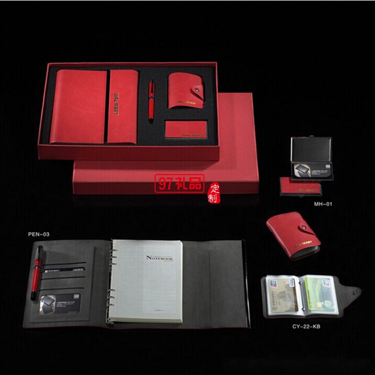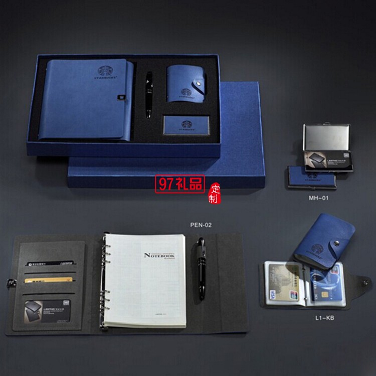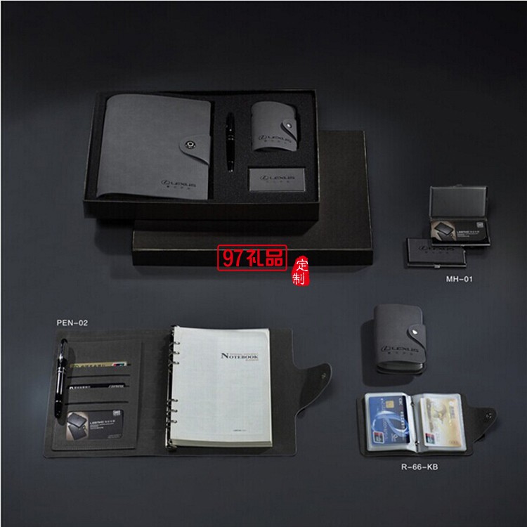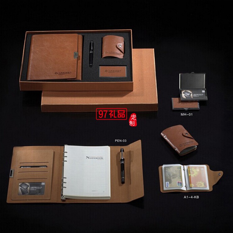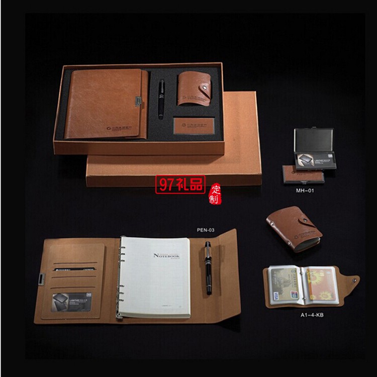 套裝包含: 3E系列活頁(yè)本、商務(wù)簽字筆、24卡位商務(wù)卡包、不銹鋼貼皮名片盒