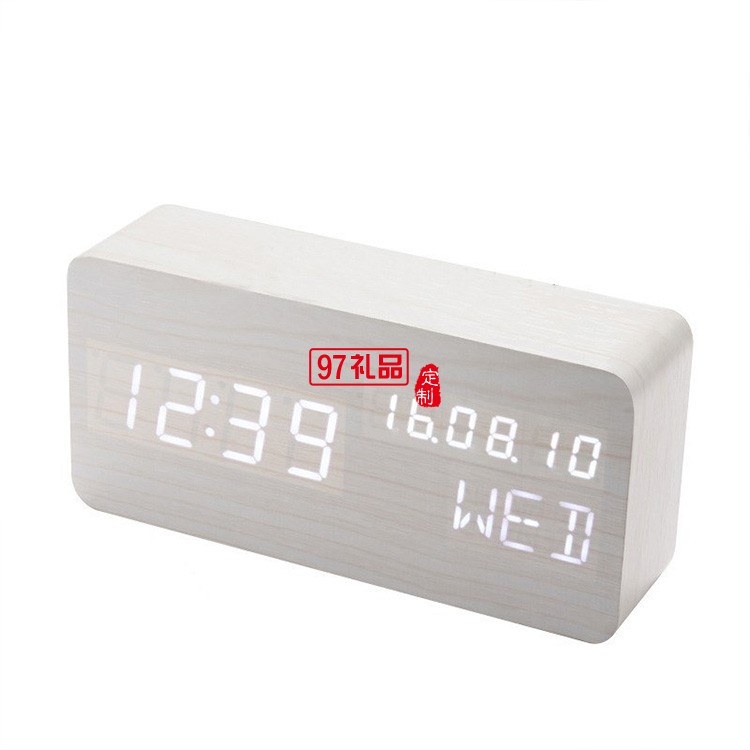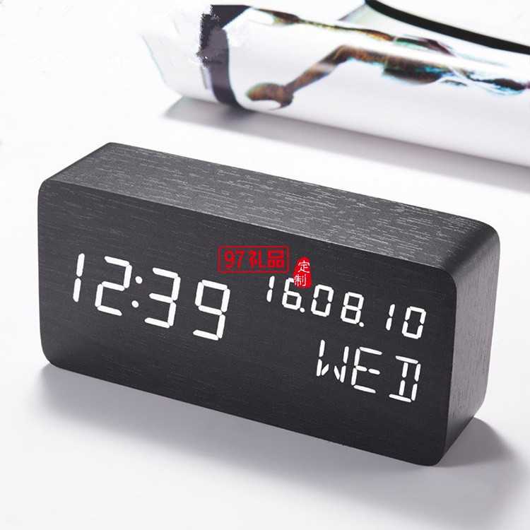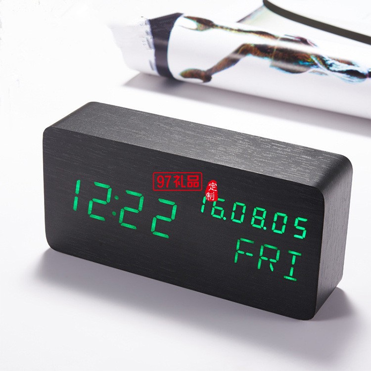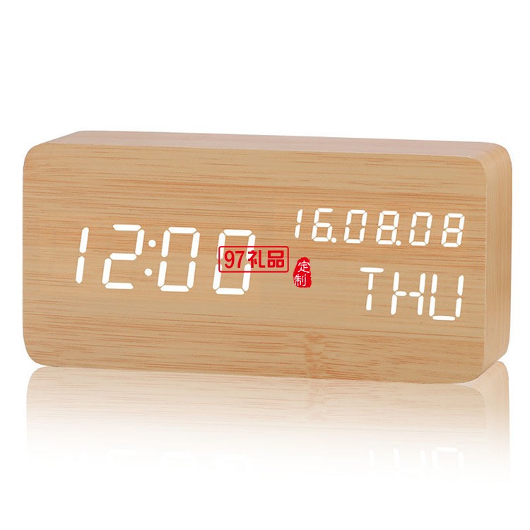 長方形萬年歷木鐘桌面 led電子聲控木頭鐘學生喚醒鬧鐘