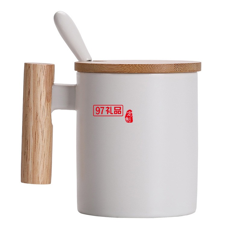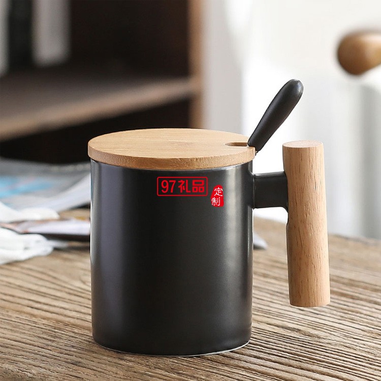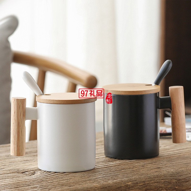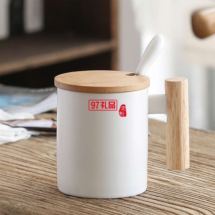 簡約馬克杯 創意文藝水杯咖啡杯木手柄陶瓷杯帶蓋勺