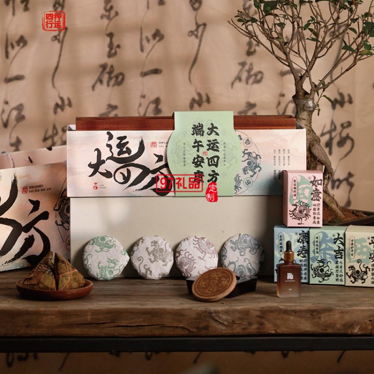 大運(yùn)四方四神木雕裝飾畫云南普洱茶蛋黃肉粽文創(chuàng)端午禮盒