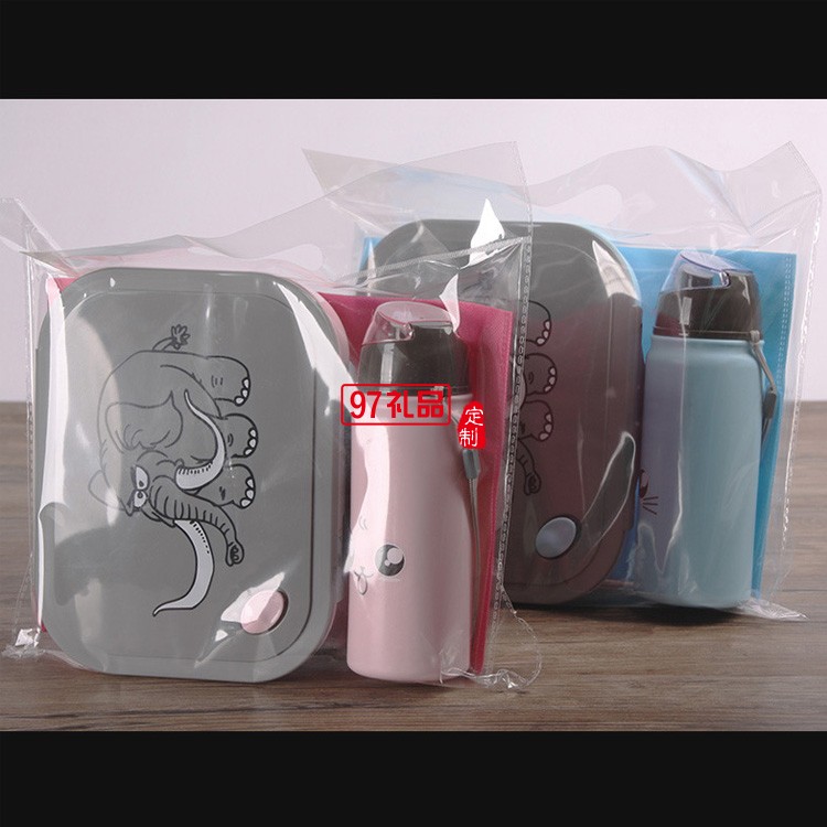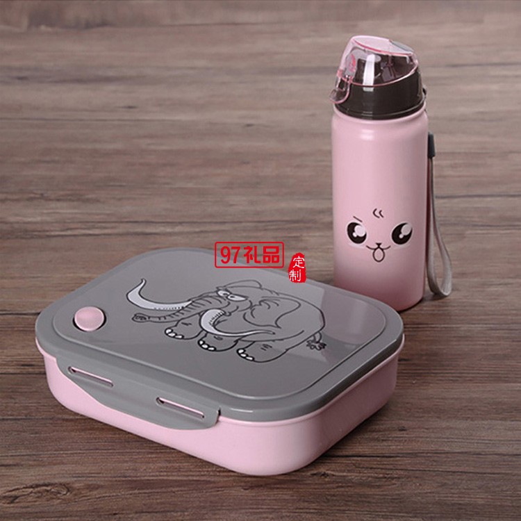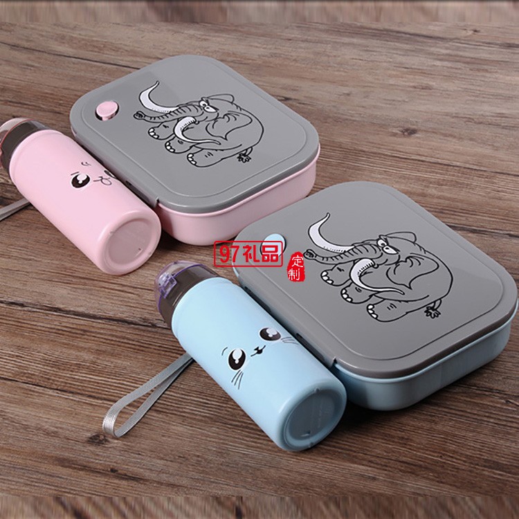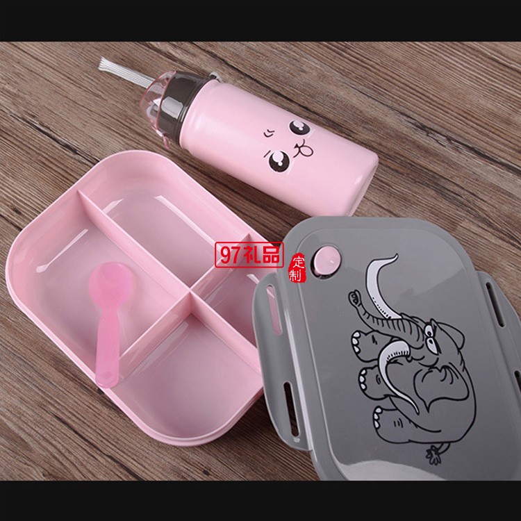 塑料學(xué)生長方形分格飯盒帶400ml水壺套裝 卡通套裝飯盒帶手提袋