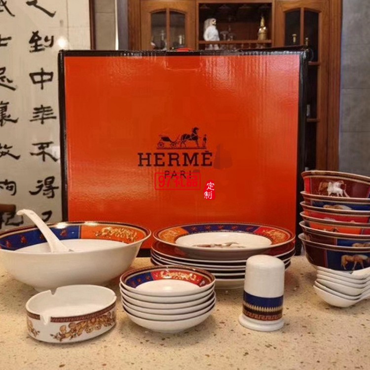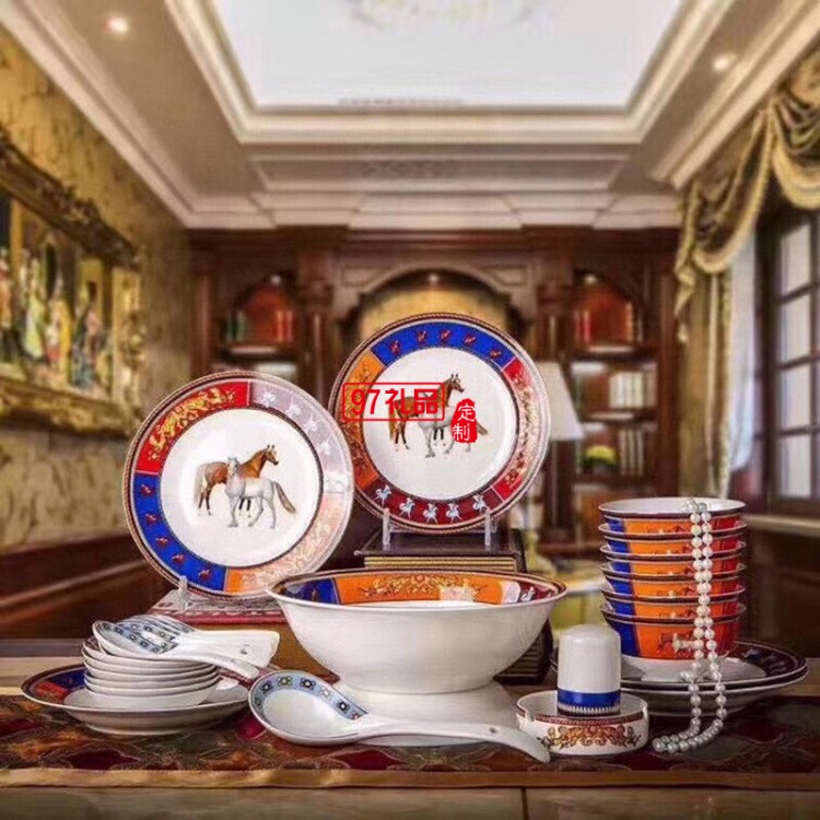 愛馬HERME白馬圖高檔骨瓷餐具28頭套裝禮盒碗盤碟瓷器歐式奢華