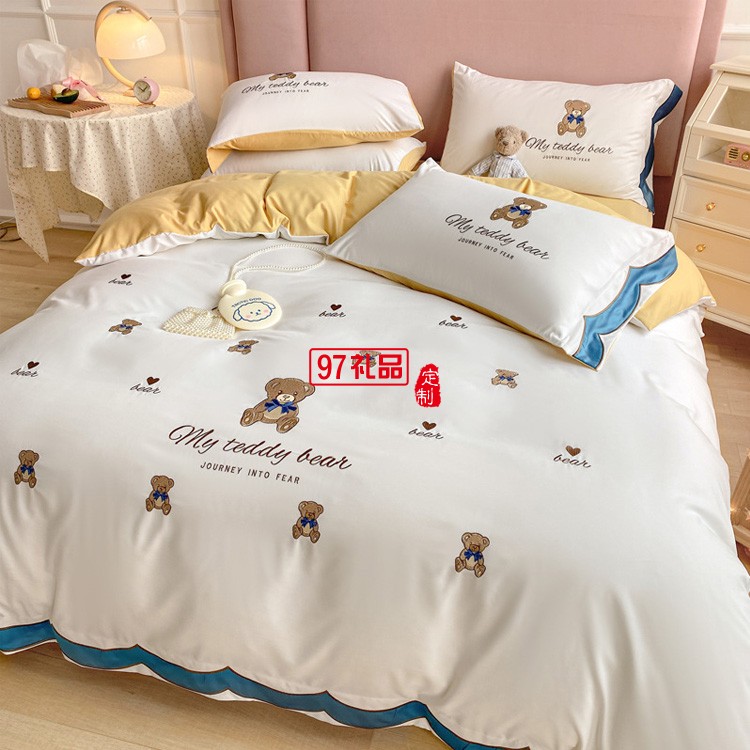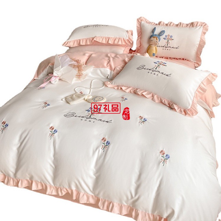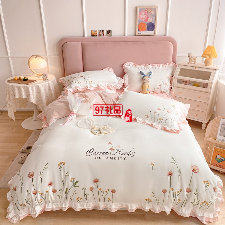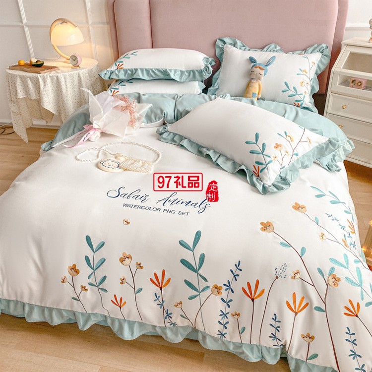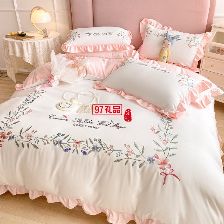 公主風全棉繡花四件套純棉花卉刺繡小清新花邊被套床上用品