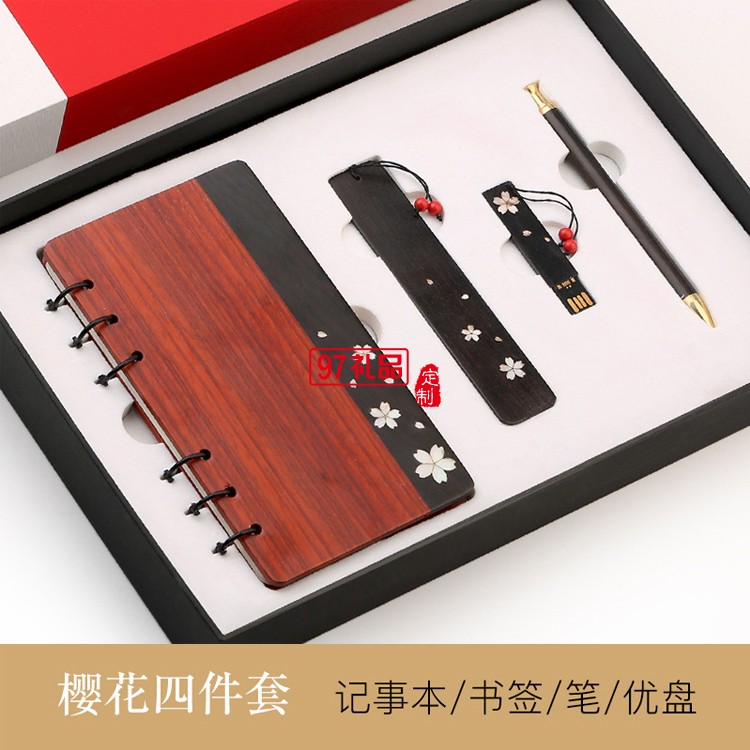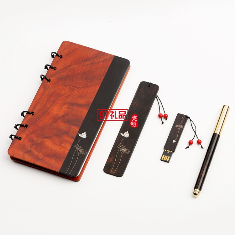 紅木質古典黃銅金屬簽字筆記事本U盤套裝文創禮品