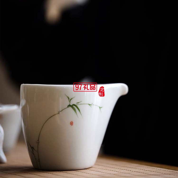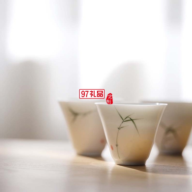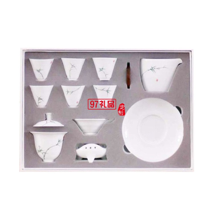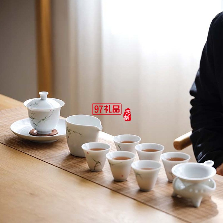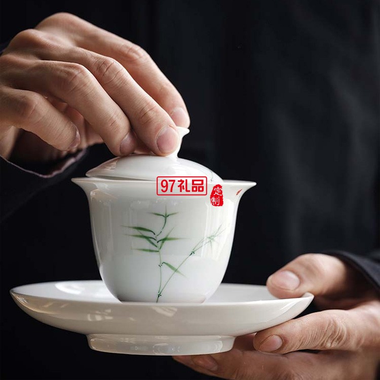 景德鎮青竹功夫茶具套裝 純手繪釉下彩整套白瓷陶瓷蓋碗茶杯