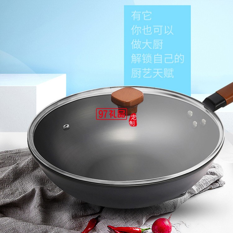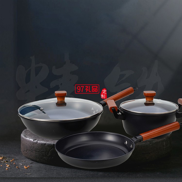 無涂層三件套不粘鍋炒鍋炒菜鍋電磁煤氣爐定制公司廣告禮品