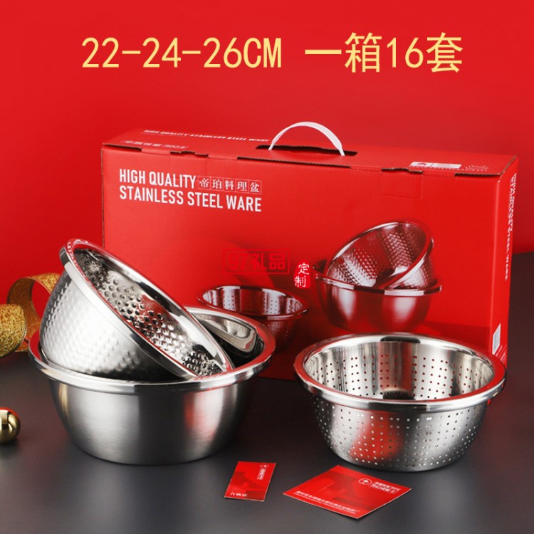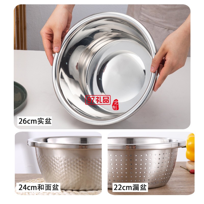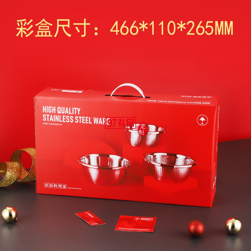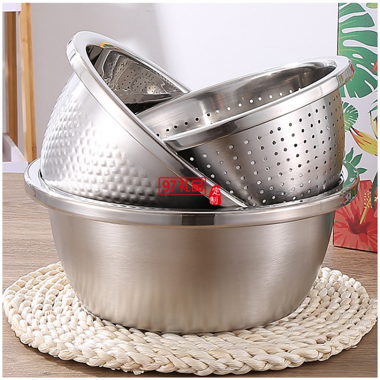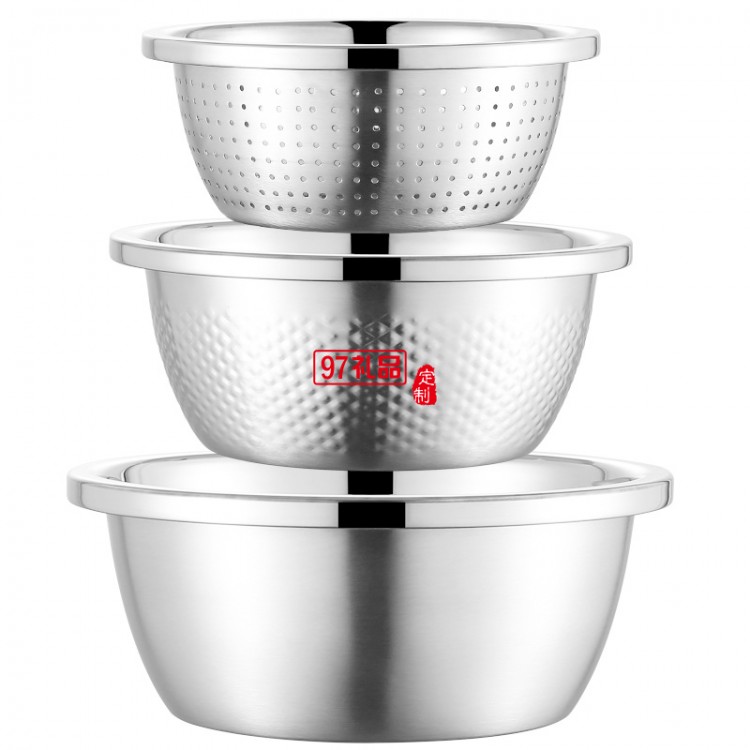 加厚不銹鋼盆米篩三件套調料缸淘米盆洗菜盆實用年貨禮品套裝盆子
