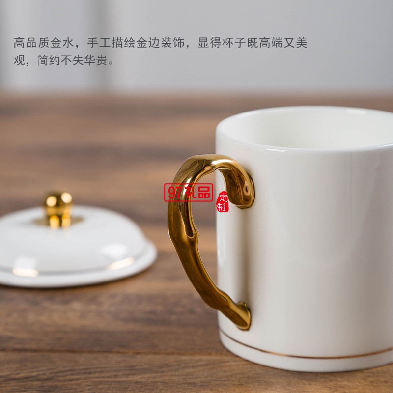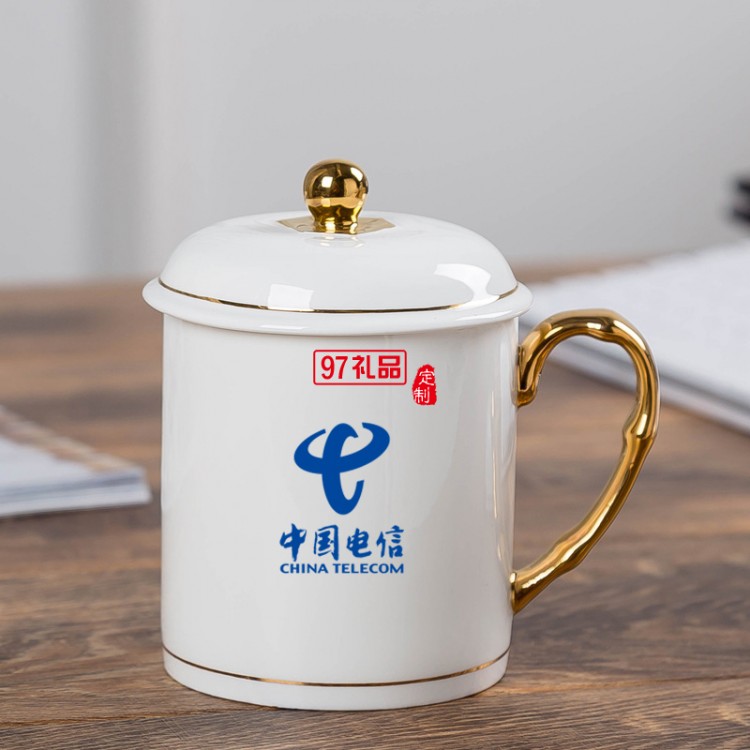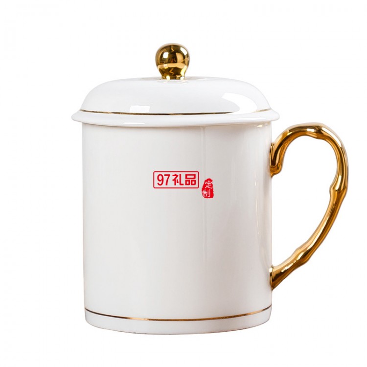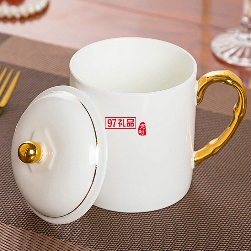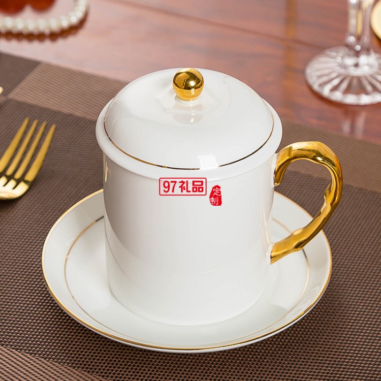 中秋國慶節禮品辦公會議杯帶蓋景德鎮陶瓷茶杯450ML明珠杯碟定制