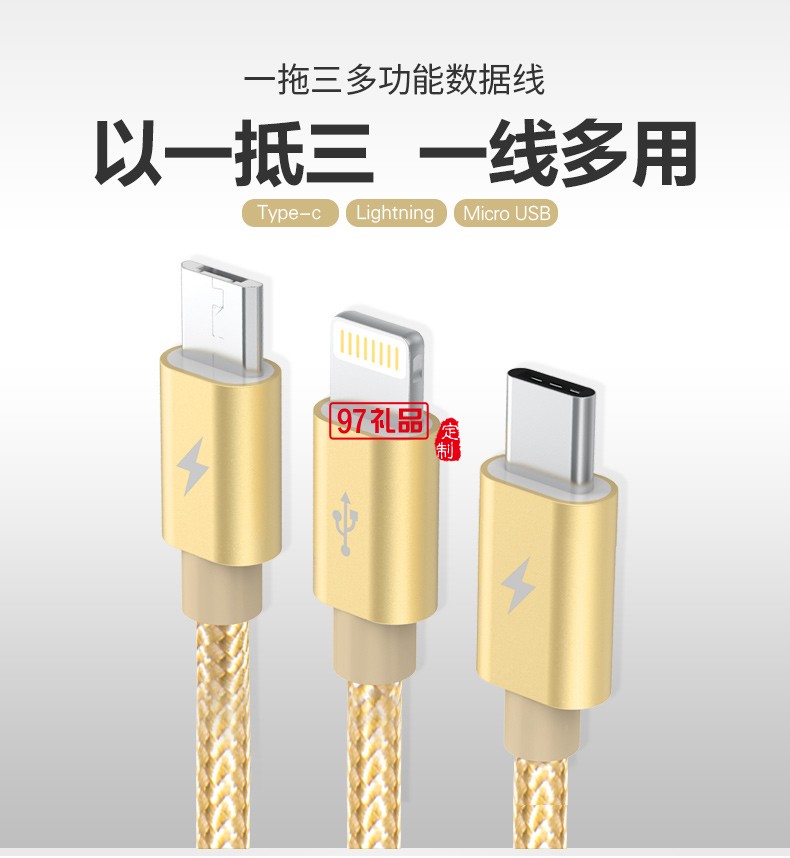 只要一條數據線,分別支持MicorUSB Ligntning Type-C三種端口,