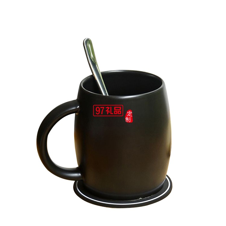 陶瓷水杯 450ml帶蓋帶勺馬克杯 亞光酒桶咖啡杯禮品杯子定制