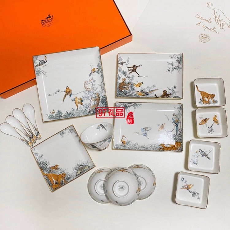 HERMES”愛馬16頭骨陶瓷鎏金餐具套裝赤道叢林系列方形盤碗碟勺禮