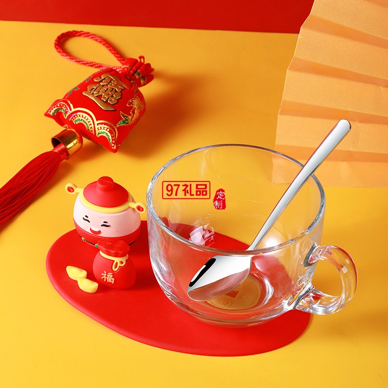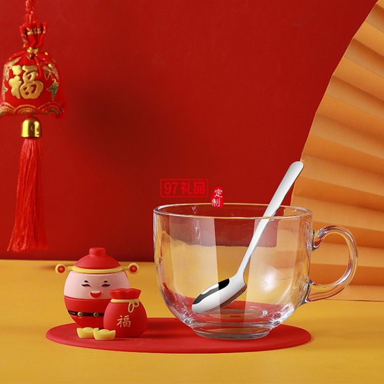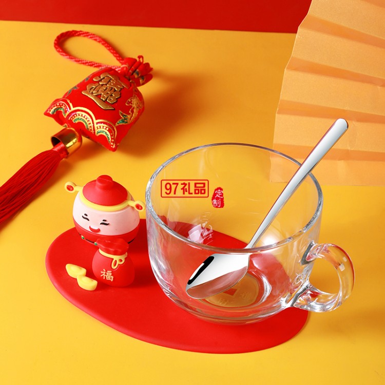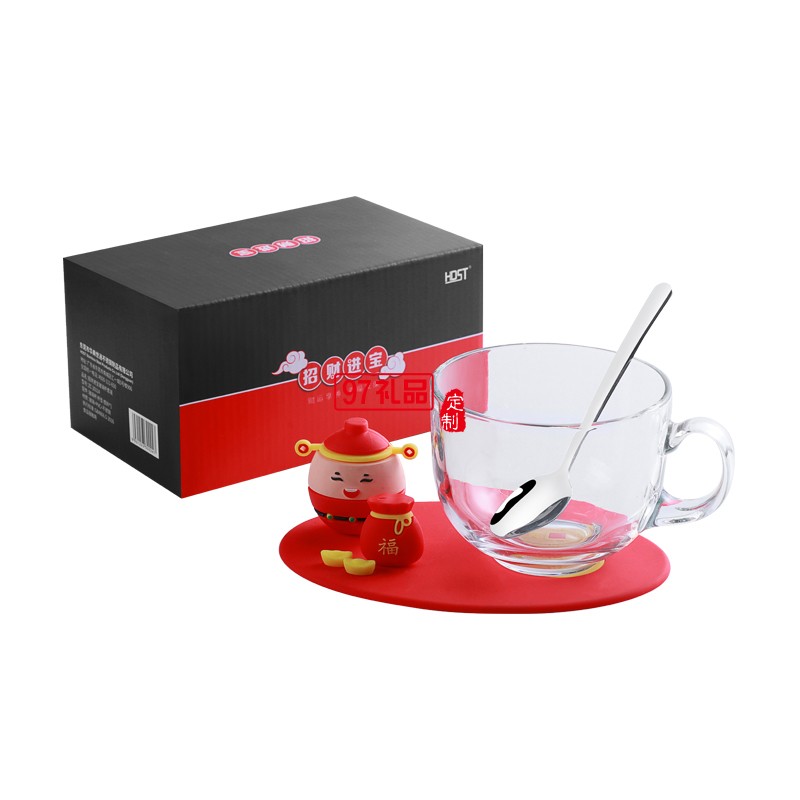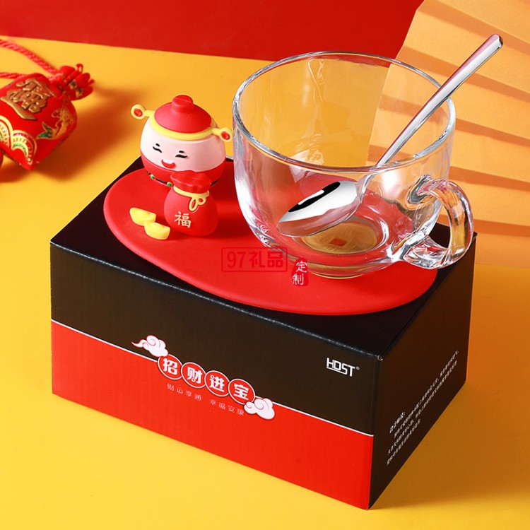 產品特點: 杯子玻璃+PVC杯墊,攪拌勺不銹鋼材質。獨特的財神爺和福袋設計,寓意招財進寶。原創設計,圖案可定制。